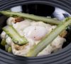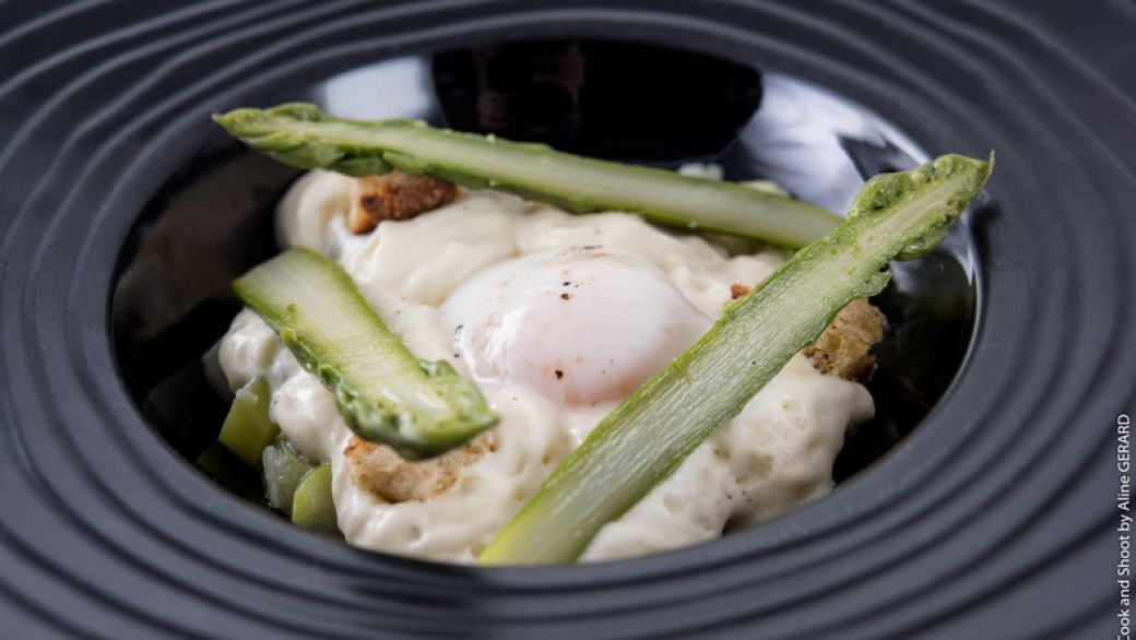 - Oeuf parfait aux petits pois et asperges vertes du pays, émulsion à la truffe 12,00€