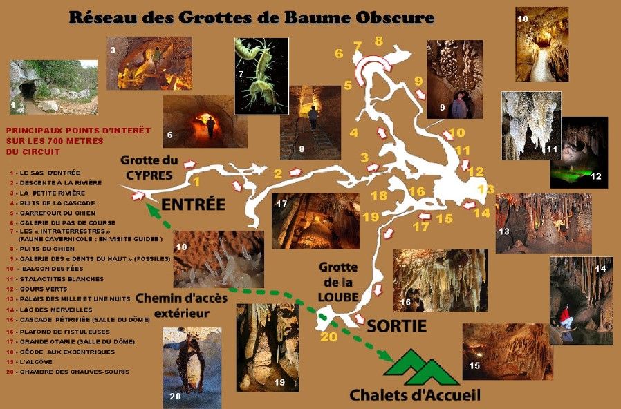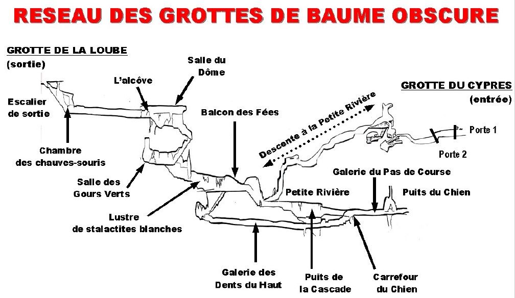 La traversée évite un aller-retour et des croisements fastidieux. Le circuit débute par l’entrée historique - la grotte du Cyprès - et se termine par la grotte de la Loube. Les deux orifices sont distants d’une centaine de mètres environ.